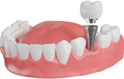 Dental implants are frequently accompanied by a dental crown in order to replace a single missing tooth. A full mouth of dental implants can be very costly, a better option is the All On Four dental implants procedure, it only requires four dental implants, no crown and a denture to replace a full arch of teeth.